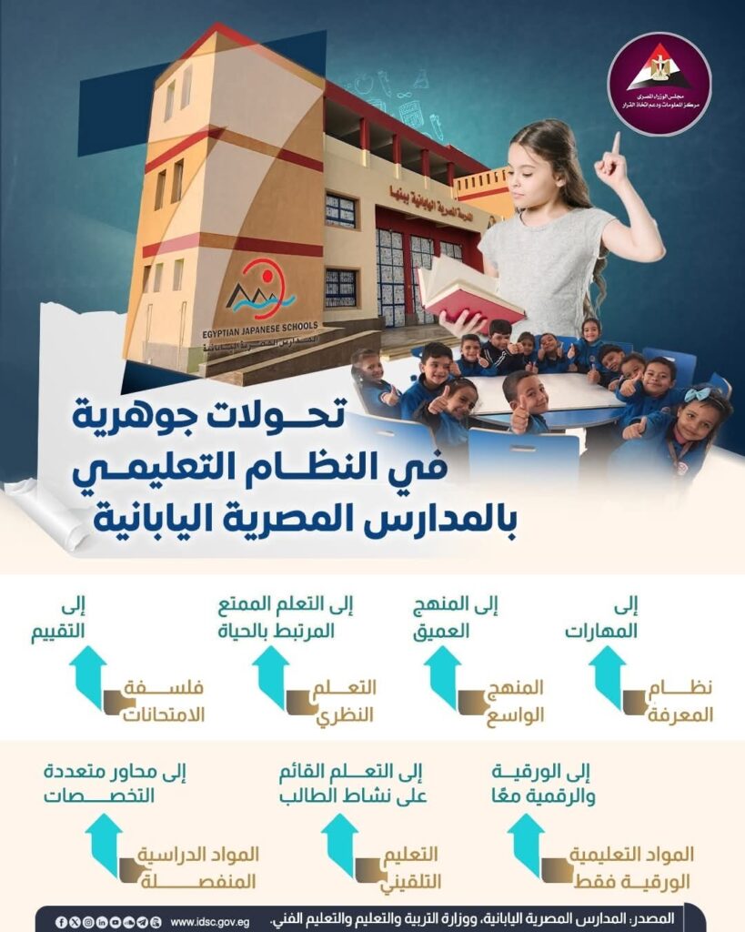 استعرض مركز المعلومات ودعم اتخاذ القرار بمجلس الوزراء، عبر سلسلة من الإنفوجراف، جهود الدولة في إطار اهتمامها بتطوير منظومة التعليم وبناء أجيال قادرة على مواكبة متطلبات المستقبل، من خلال تجربة “المدارس المصرية اليابانية”، باعتبارها أحد النماذج التعليمية الحديثة التي تطبق فلسفة تعليمية شاملة، تستند إلى أنشطة “التوكاتسو”، الهادفة إلى تنمية شخصية الطالب المصري بصورة متكاملة.